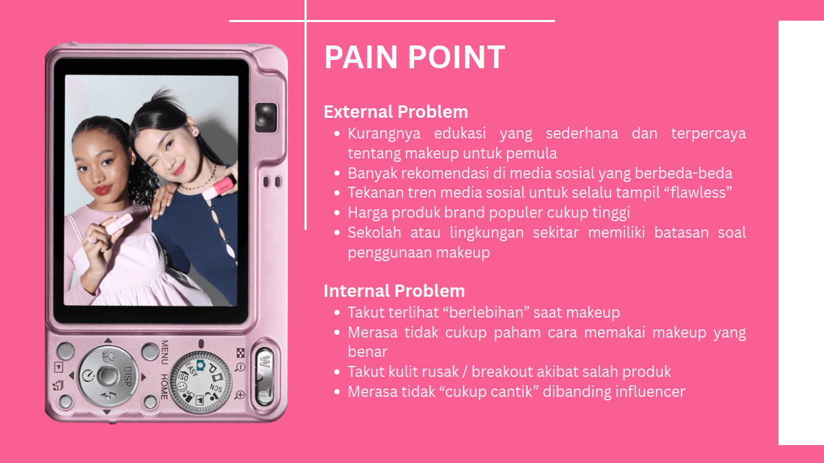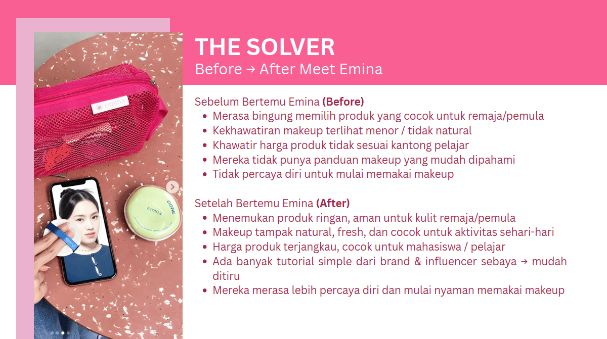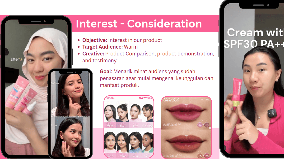 Developed a comprehensive consumer journey mapping for Emina to identify key touchpoints across the entire user lifecycle. The project included persona analysis to understand consumer pain points and product solutions, full-funnel marketing framework from cold audience to retention stage, and strategic channel selection with clear justification for each funnel stage. Delivered a complete Consumer Journey Deck with visual examples and channel recommendations to guide marketing strategy.